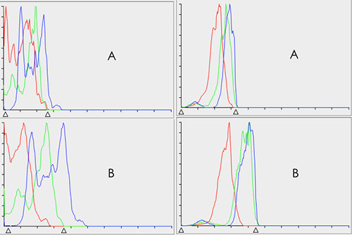 掃描了 2 組底片,2 組都是完全一模一樣的照片,只是底片的沖洗不一樣,可見顯影不足的 A 圖色彩過度曲線明顯要都短于 B,從數據上體現了色彩過度,以及寬容度的缺失。