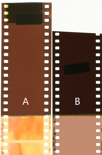 其中 A 沖洗的時候顯影液兌水,模擬藥水不新鮮或失效,而 B 是新鮮藥水標準制作。